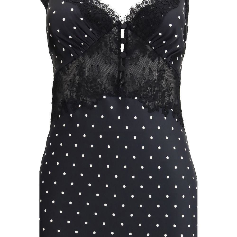 The polka dot satin maxi Dress by Self Portrait takes inspiration from lingerie, combining playful polka dots with sensual lace trims. The fluid silhouette is enhanced by a flowing mermaid hem, while the low-cut back adds a striking and feminine touch. Crafted from slightly stretchy fabric and true to size, the design features a button-down front closure and delicate lace details, making it an elegant statement piece to wear with heels for a confident entrance.