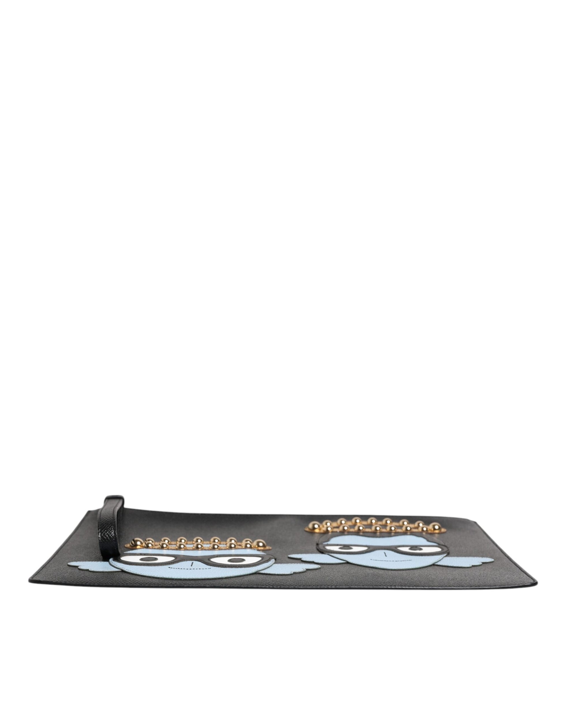 Black Leather #DGFAMILY Embellished Men Zip Pouch Bag